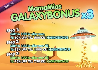 Nu har du alltså chansen att få Mama Mias galaxybonus tre gånger! I dag, tisdagen den 27:e januari, är det som gäller om du inte vill missa detta erbjudande. Allt som allt kan du få upp till inte mindre än 2250 kronor i Galaxybonus genom att du följer tre insättningssteg. Tänk så roligt du kan ha för tre bonusar!